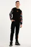 Костюм свободного кроя выполнен из футера 2-х нитки. Состоит из толстовки и брюк. Толстовка с манжетами и поясом из эластичного трикотажа. Рукав втачной со спущенной линией плеча. Брюки свободной посадки с карманами и манжетами из эластичного трикотажа.