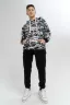 Костюм свободного кроя выполнен из футера 2-х нитки. Состоит из толстовки и брюк. Толстовка с манжетами и поясом из эластичного трикотажа. Рукав втачной со спущенной линией плеча. Брюки свободной посадки с карманами и манжетами из эластичного трикотажа.