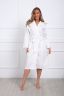 Модель халата: кимоно с воротником типа планка, длинными рукавами, накладными карманами, поясом. Фасон кимоно имеет свободный крой, отсутствуют какие-либо застежки, широкие рукава. Халат идеально сядет на любую женскую фигуру. Предназначение халата: для дома, бани, сауны, бассейна, spa-процедур.