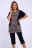 Костюм женский выполнен из трикотажного полотна кулирка. Костюм состоит из футболки и бридж. Футболка свободного силуэта. Подрезные бочка выполнены из гладкокрашенного полотна- компаньона.  Карманы в подрезных бочках, спущенное плечо,  углубленная пройма, горловина и рукава окантованы двойным кантом. Бриджи прямые, цельнокраенный пояс на резинке.