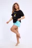 Костюм женский, выполнен из трикотажного полотна кулирка. Костюм состоит из футболки и шорт. Футболка свободного силуэта, горловина окантована, на полочке выполнена печать.
