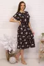 Летнее лёгкое платье из тонкой ткани с цветочным принтом. Модель длиной чуть ниже колена, отрезная по линии талии, с напускным верхом и коротким цельнокроеным рукавом. В поясе мягкая резинка. На округлой горловине небольшой вертикальный разрез на завязках. Удобное платье на каждый день.