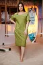 Платье женское полуприлегающего силуэта, на подкладке. Вырез асимметричный, с одной стороны бретель с кокосовой пуговицей. На полочке и спинке кокетка из отделочной ткани. Рукав цельнокроеный до локтя на манжете. На полочке накладные карманы со складками. В боковых швах разрезы.