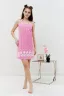 Сорочка на бретелях полуприлегающего силуэта, с фигурной линией низа, длиной выше колена. На полочке внизу обработан декоративный разрез. Проймы, бретели и разрез на полочке обработаны бейкой из основного полотна.